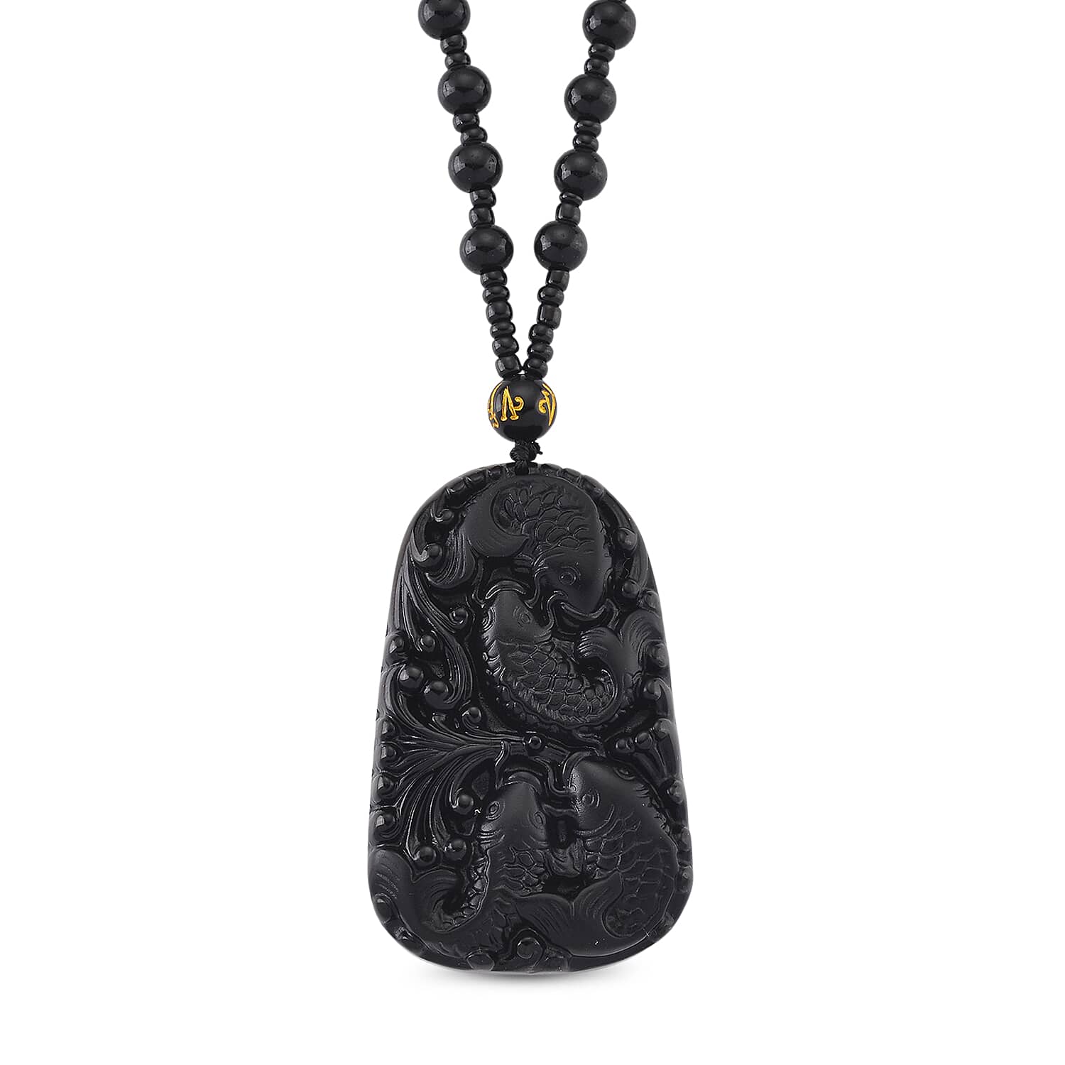 Black Obsidian 340.00 ctw Carved Fish Pendant with Beaded Necklace 26 Inches