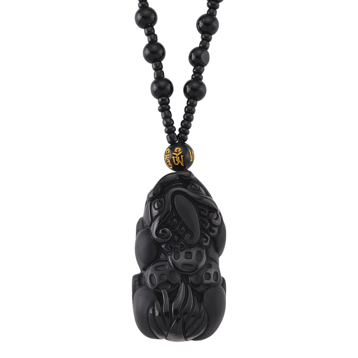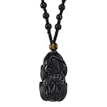 Black Obsidian 340.00 ctw Carved Pixiu Pendant with Beaded Necklace 26 Inches