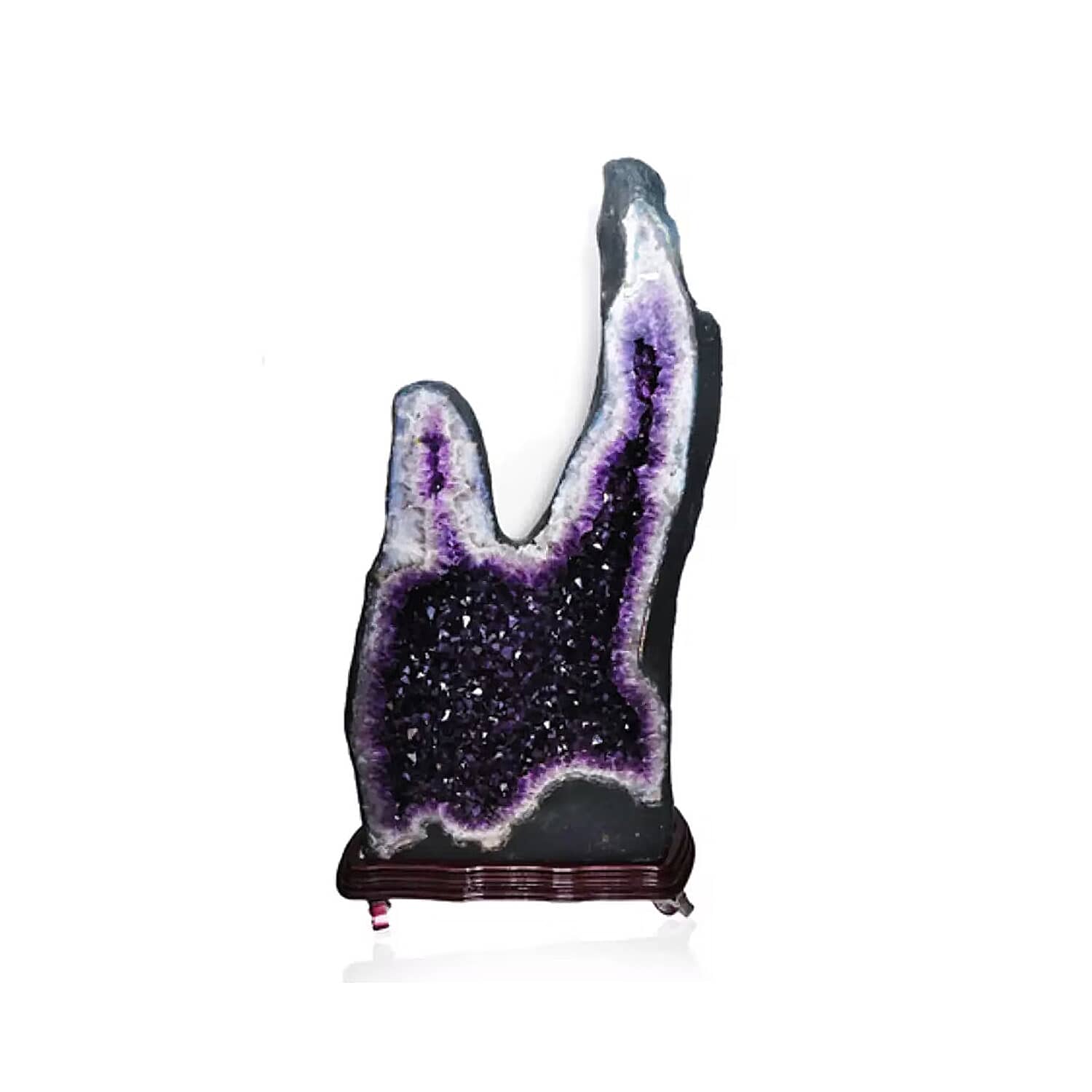 A. This decorative Uruguayan amethyst geode weighs 754 lbs, offering a grand, commanding presence perfect for homes, offices, or luxury lobbies.