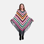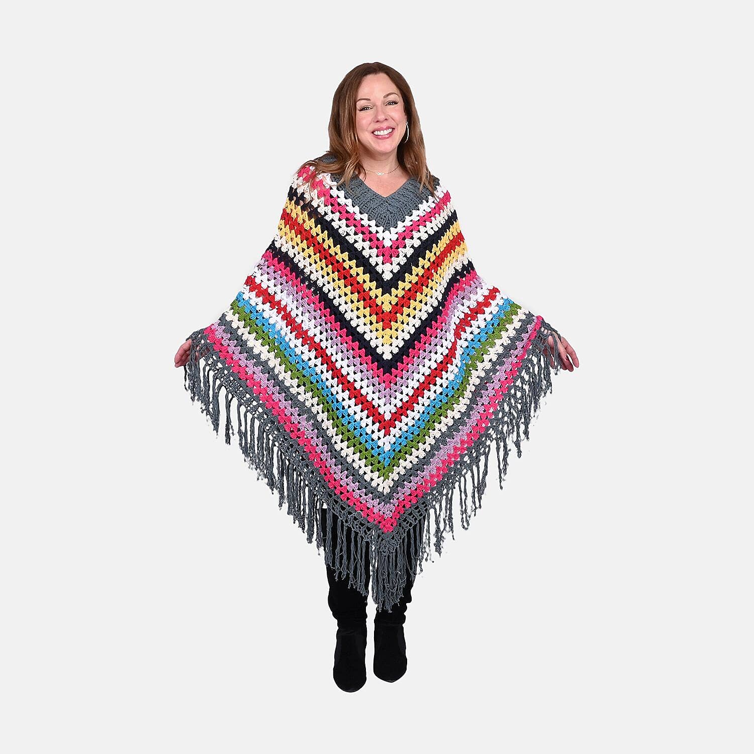 Tamsy Dark Gray with Multicolor Stripe Pattern Cotton Hand Chrochet Poncho - One Size Fits Most