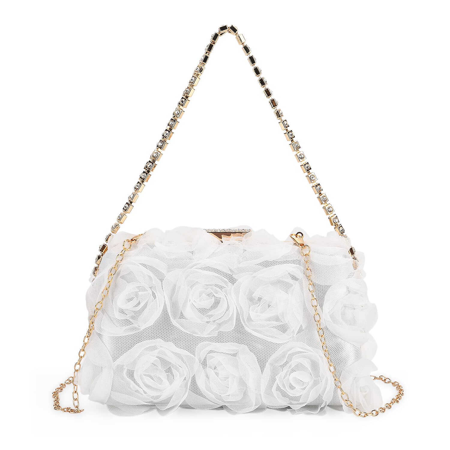 White 3D Flower Crystal Evening Clutch Bag with Shoulder Chain Strap